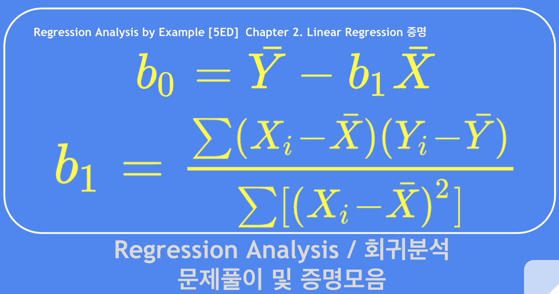 Least squares method의 기울기와 절편을 증명하는 내용입니다. 예전에 관련글을 올리긴 했는데 증명을 영상으로 보고싶단 분들이 많아서 만들어보았어요. Regression Analysis by Example의 Chapter 2, Excercise 1-e에 나와있는 문제이기도 합니다. 참고하세요~