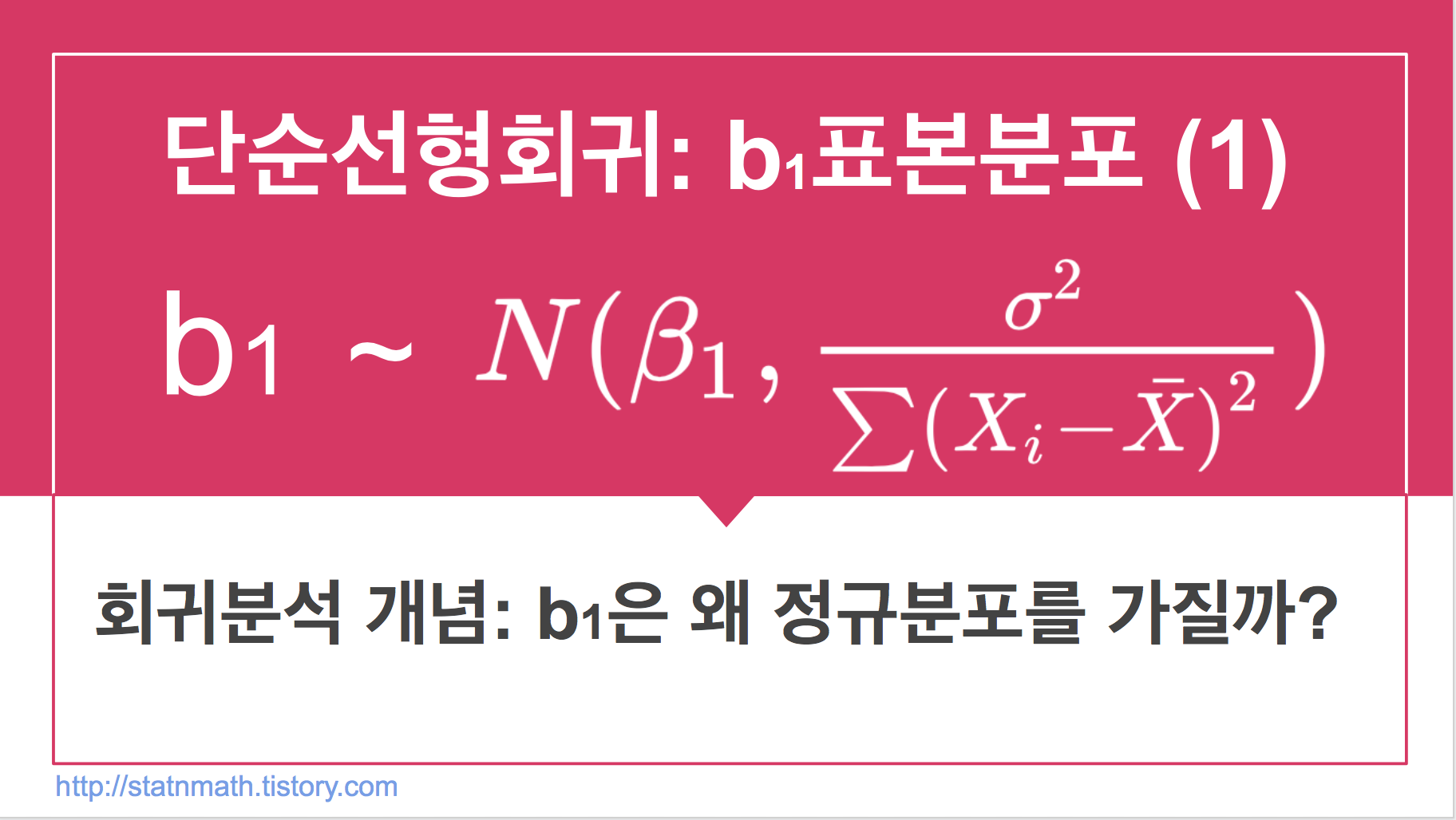 회귀모델에서 가장 중요한 가정인, error값은 무작위적인 랜덤인 값으로 정규분포 평균 0 과 분산 sigma^2의 값을 가지고 있다는건데요. 그래서 Y역시 random 값을 가지게 되고, beta_0과 beta_1을 추정하는 b0과 b1의 식에서 Y값이 들어있기때문에 이들 역시 random variable이 됩니다.