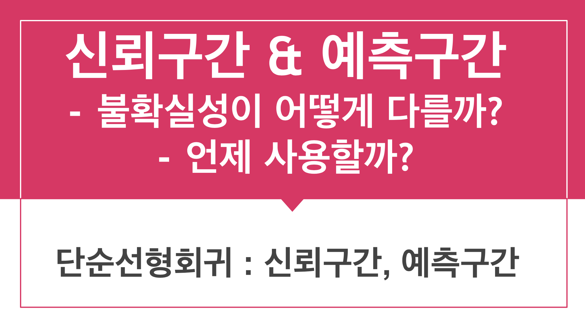 단순선형회귀식에서 신뢰구간과 예측구간, 두 구간이 있는데, 불확실성이 어떻게 다른지 생각해보신적 있나요? 짧게 요약해서 예측구간은 moving target을 위한 값이고 신뢰구간은 fixted target을 위한거라고 말할 수 있어요. 혹시 이 문장이 이해가 안가신다면 이 영상을 확인해주세요.