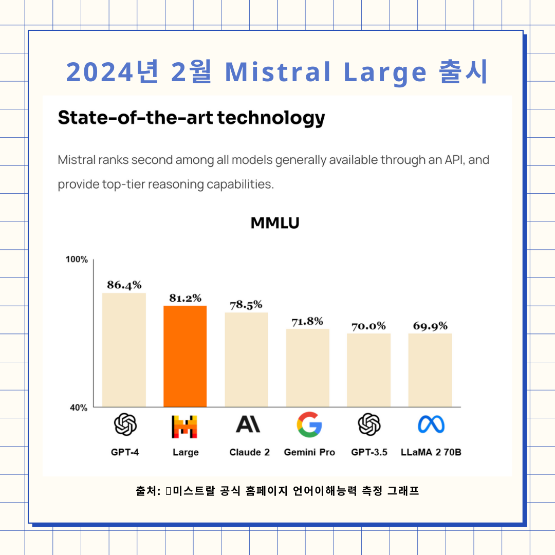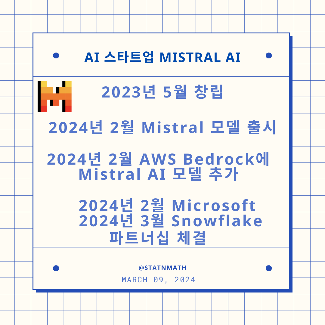 2023년 5월 창립 후, 2024년 2월 미스트랄 라지 모델이 출시해서 그 결과 GPT의 5분의 1, 성능은 거의 비슷하다고 합니다. 출시되자마자 2024년 2월에 AWS Bedrock에 미스트랄 모델이 추가 되었고, 3월엔 Microsoft 파트너십을 맺어 Azure에도 넣는다고 합니다. (이미 가능한지 모르겠어요. 전 AWS를 사용해서요) 또한 이번에 Snowflake와 파트너십을 맺었는데요. Snowflake는 Mistral이 구축한 모든 모델을 데이터 클라우드로 가져와서 LLM 앱을 구축하는 고객에게 직접 사용할 수 있도록 할 계획이라고 합니다.