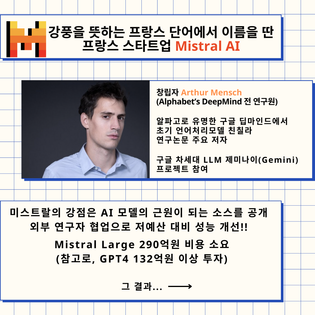 멘쉬의 생각은 빅테크 회사에서 불투명한 기술을 만들고 싶지 않아서 오픈소스 AI개발을 결심했다고 합니다. 그리고 미국이 주도하고 있는 AI시장에 맞서 프랑스 스타트업이라는 것도 주목할만 했고요.